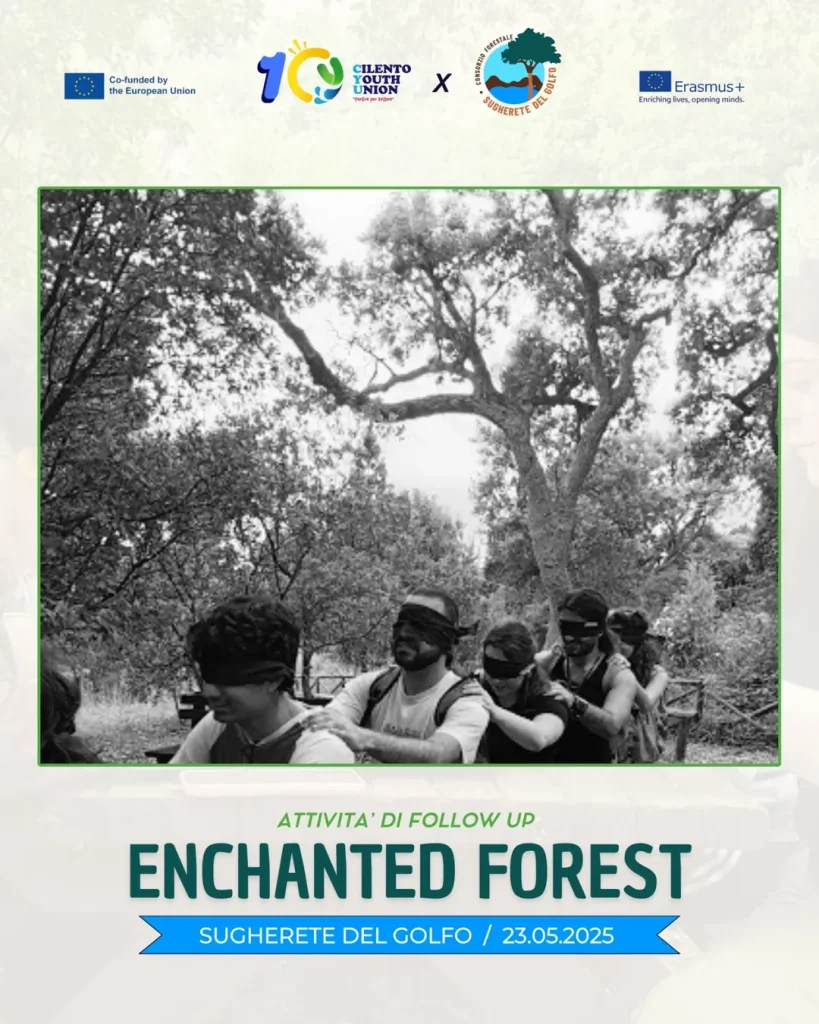 Enchanted Forest Erasmus+, follow-up Erasmus, educazione non formale, Cilento Youth Union, attivitĂ outdoor, esperienza sensoriale, apprendimento esperienziale, Erasmus in Italia, supereroi Erasmus, Erasmus+ 2025.