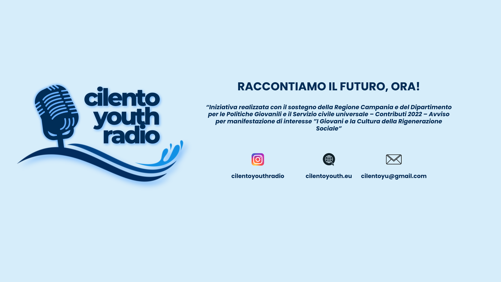 CilentoYouthRadio evoca il tema della giovinezza coniugato, in maniera provocatoria e stimolante, alla nostra amata terra cilentana, afflitta da uno stereotipo di vecchiaia. Un approccio simile che adotta giovinezza significa volere riesplorar il territorio, approfondirlo, conoscerlo sempre di più, poterlo presentare, comunicare, raccontare proiettandolo nel futuro, tirando fuori le energie più genuine, più autentiche di questo territorio e della sua anima. Uno studio del Cilento, considerando il senso peregrino dell’espressione di applicarsi attivamente, amare, libero, creativo giovane condotto attraverso la radio.