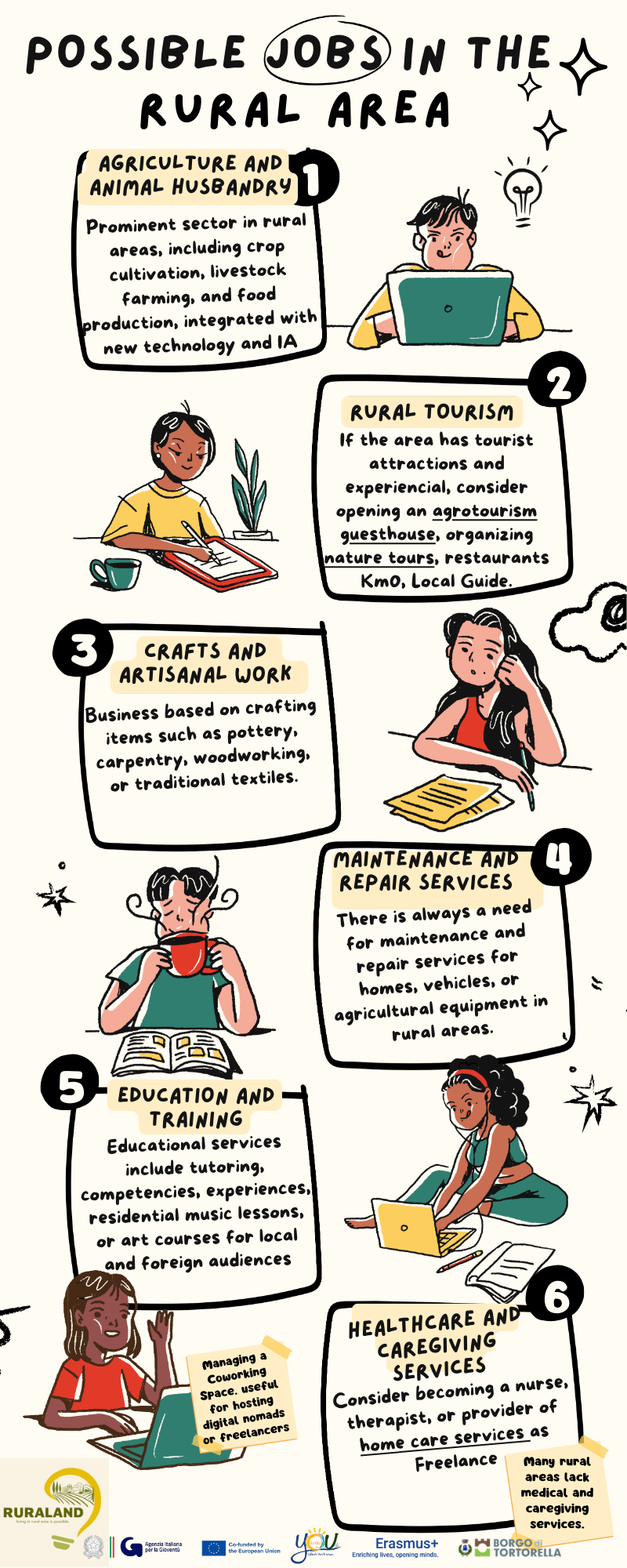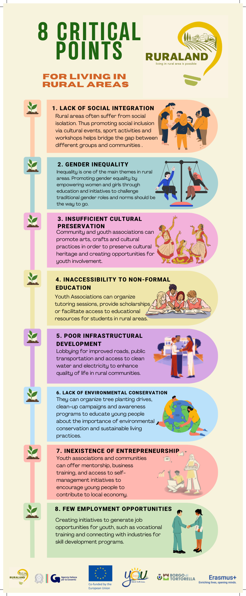 Il percorso intrapreso ha portato i giovani coinvolti a prendere coscienza sulle varie sfide che i territori rurali possono rappresentare per chi sogna di avviare un’attività. Ma allo stesso tempo si è sensibilizzato sull’importanza di valorizzare in modo sostenibile tutte le risorse a nostra disposizione, sia digitali che naturali. Come di consueto, tutte le attività sono state realizzate con metodologie non formali: workshop, discussioni aperte, brainstorming e lavori di gruppo hanno portato i partecipanti a realizzare quelli che sono i risultati di progetto, confluiti in quattro infografiche: